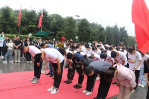 从故居再来到毛泽东同志纪念馆,纪念馆为全国唯一一家系统展示毛泽东主席生平事迹、思想和人格风范的纪念性专题博物馆。在参观纪念馆之前,韶山红色宣讲员在风雨亭饱含深情地向大家讲述了毛泽东六位亲人为革命牺牲的感人事迹,同学们认真聆听,深受鼓舞。最后,宣讲员以“舍小家为大家,愿为历史砥砺前行”这句振奋人心的话结束了本次的讲解。接着,大家来到了毛泽东铜像广场。铜像周围青松翠竹掩映,主席铜像身着中山装,巍然挺立。在毛主席的铜像前,全体师生列队站立,怀着对伟人无比崇敬的心情庄严地向主席铜像敬献花篮,并深深三鞠躬。